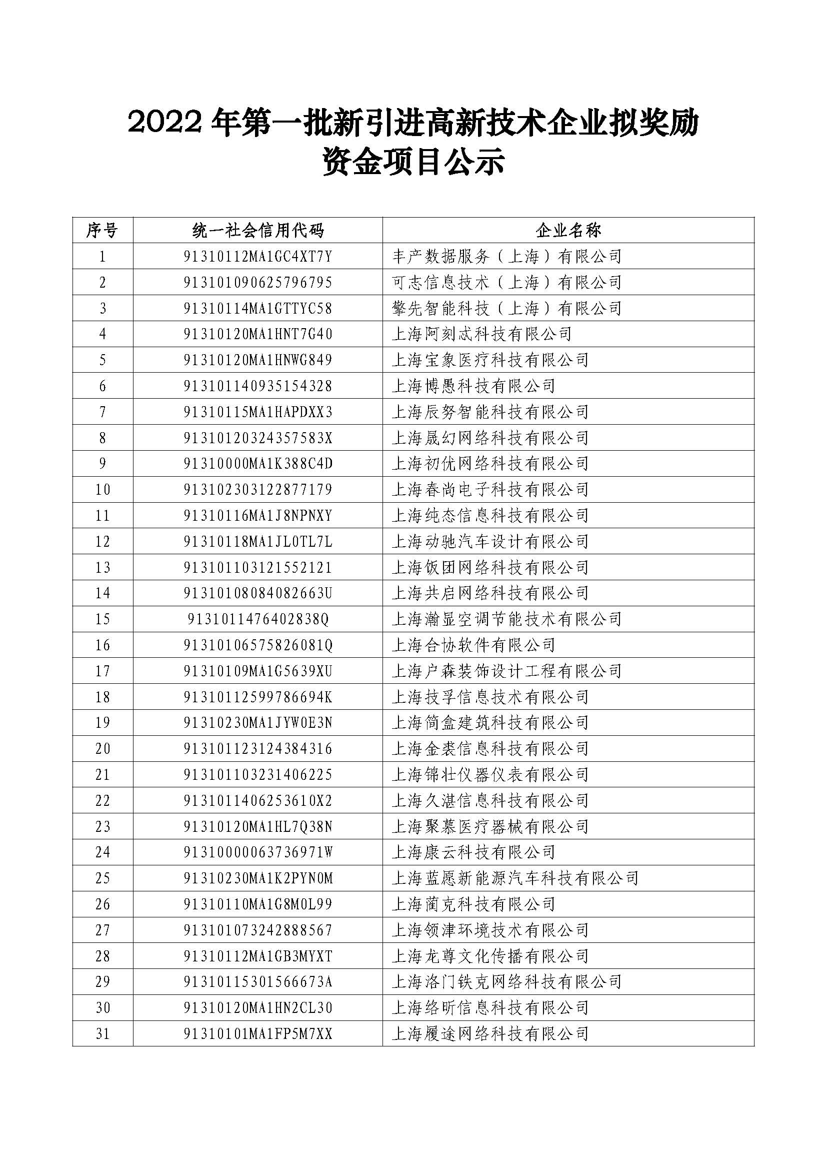 根据《宝山区加快建设上海科创中心主阵地促进产业高质量发展政策》和《宝山区加快建设上海科创中心主阵地促进产业高质量发展政策管理办法》文件精神,现将我区2022年第一批新引进高新技术企业拟奖励资金项目予以公示。