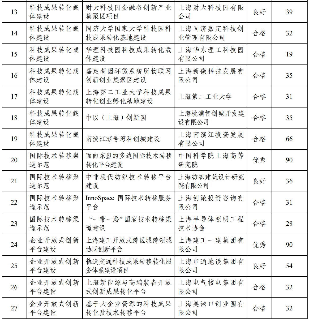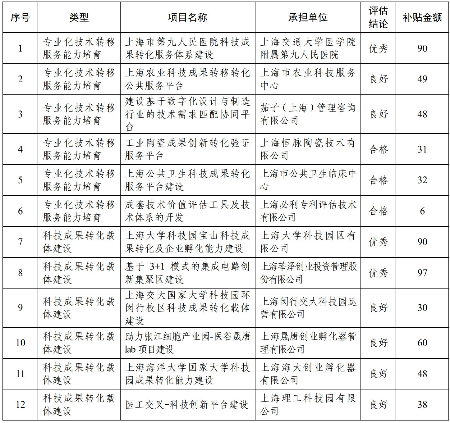 2021-2022年度科技成果转化服务体系建设项目绩效评估工作已经结束。根据专家评审和公示结果,上海市科学技术委员会公布“上海市第九人民医院”等实施的27个项目评估结论,并按规定予以补助,补助金额共计1269万元,详见附件。