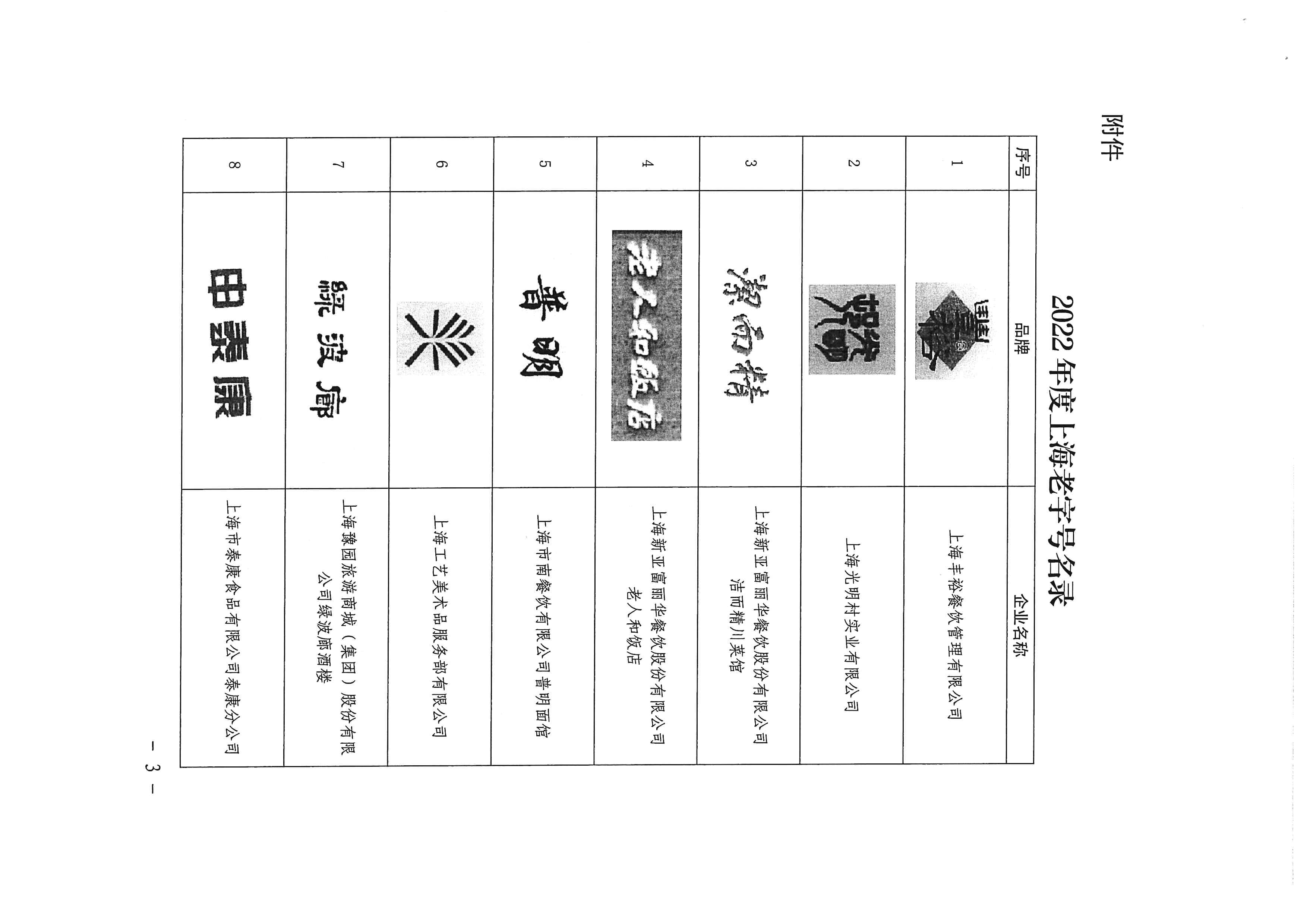 为贯彻落实《商务部等8部门关于促进老字号创新发展的意见》(商流通发〔2022〕11号),根据《关于开展上海老字号认定的若干规定》(沪商规〔2022〕3号),经各区商务主管部门初审,市商务委、市经信委、市市场监管局、市知识产权局、市文旅局等部门复审,信用审查,社会公示等规范程序,确定了2022年上海老字号名录,现予以公布。请各区和各有关单位共同做好上海老字号促进与保护工作。