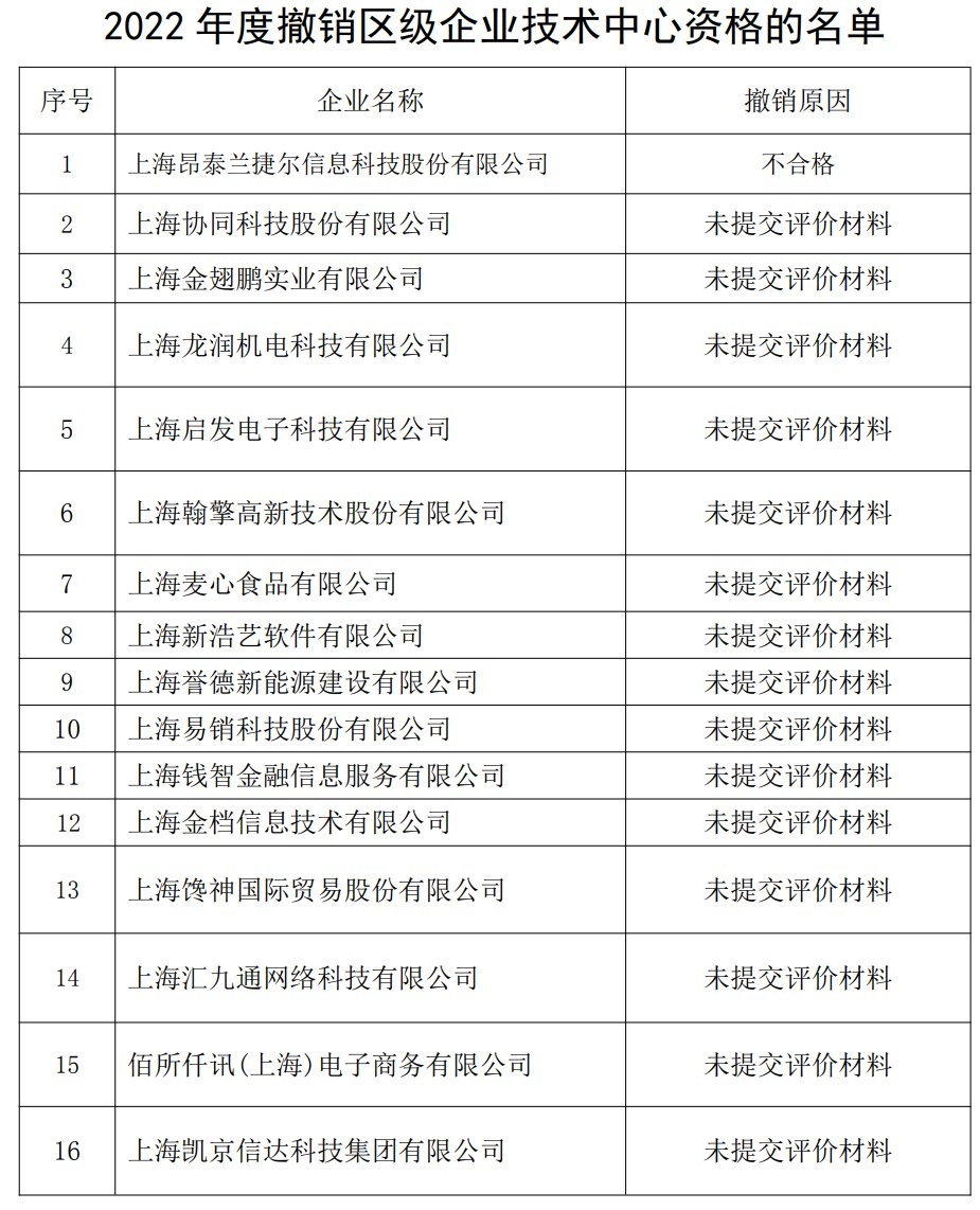 未通过评价的企业技术中心共16家。其中:上海昂泰兰捷尔信息科技股份有限公司企业技术中心的评价得分低于60分,评价结果为不合格。上海协同科技股份有限公司等15家企业技术中心未提交评价材料。