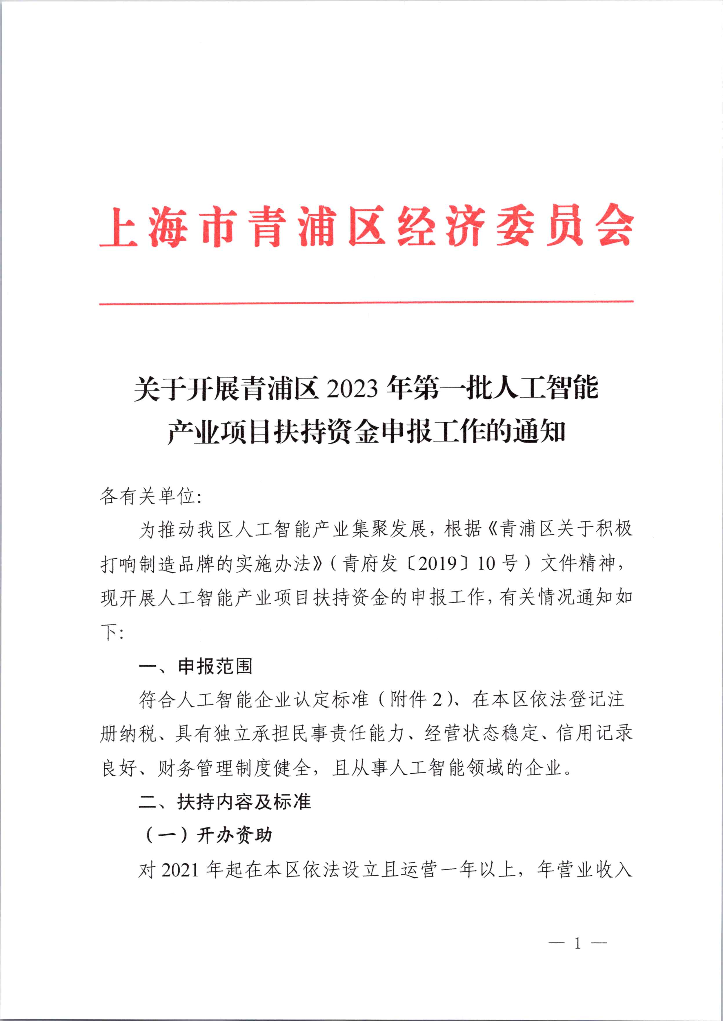 关于开展青浦区2023年第一批人工智能产业项目扶持资金申报工作的通知